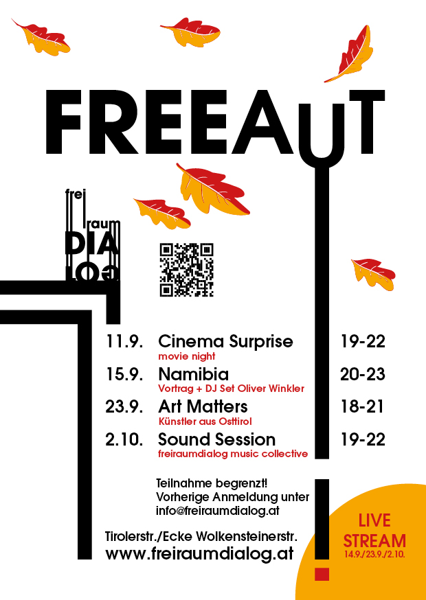 Den Auftakt bildete am 11.09.2019 die Veranstaltung Cinema Surprise, ein gemeinsamer Filmabend, der bewusst ohne vorab kommunizierten Titel stattfand. Die offene Dramaturgie lud dazu ein, sich unvoreingenommen auf das Medium Film einzulassen und Kino als kollektives Erlebnis neu zu erfahren. Am 15.09.2019 folgte der Abend Namibia, bei dem Oliver Winkler in einem Vortrag persönliche Einblicke und visuelle Eindrücke seiner Reise vermittelte. Der inhaltliche Teil wurde durch ein anschließendes DJ-Set erweitert, wodurch sich Information, Atmosphäre und Musik zu einem fließenden Abendformat verbanden. Mit Art Matters am 23.09.2019 rückte die bildende Kunst aus Osttirol in den Fokus. Künstlerinnen und Künstler aus der Region präsentierten ihre Arbeiten und traten in einen offenen Dialog über zeitgenössische Kunstpraxis, regionale Verankerung und künstlerische Haltung. Die Veranstaltung verstand sich als Plattform für Sichtbarkeit und Vernetzung. Den Abschluss der Reihe bildete am 02.10.2019 die Sound Session, gestaltet vom freiraumdialog music collective. In einem experimentellen musikalischen Rahmen wurde der Raum selbst zum Instrument, Klang zum verbindenden Element zwischen Publikum und Auftretenden. Teile der Veranstaltungsreihe wurden zusätzlich als Live-Stream übertragen und öffneten den Freiraum Dialog über den physischen Ort hinaus. FREEAUT zeigte exemplarisch den Anspruch des Vereins, unterschiedliche künstlerische Ausdrucksformen zusammenzuführen und temporäre Räume für zeitgenössische Kultur und Dialog zu schaffen.