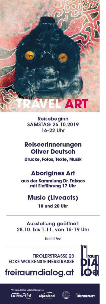 Am 26. Oktober 2019 fand die Veranstaltung Travel Art als Ausstellung und Begegnungsraum statt. Im Mittelpunkt standen die Reiseerfahrungen des Künstlers Oliver Deutsch, der in seinen Arbeiten Eindrücke und Beobachtungen aus verschiedenen Regionen Europas verarbeitete. Fotografien und visuelle Fragmente erzählten von Bewegung, Übergängen und persönlichen Momenten des Unterwegsseins. Ergänzt wurde die Ausstellung durch den Kunstsammler Dr. Michael Takasc, der einen ausgewählten Teil seiner Aborigines-Sammlung präsentierte und damit einen erweiterten kulturellen und geografischen Horizont eröffnete. Unterschiedliche künstlerische Perspektiven traten in einen Dialog über Herkunft, Wahrnehmung und kulturelle Identität. Der Abend klang in offener Atmosphäre mit Live-Musik aus und verband Ausstellung, Austausch und gemeinsames Erleben. Veranstaltet von Freiraum Dialog, entstand ein temporärer Raum für Kunst, Musik und Begegnung.